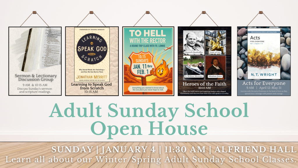 All are invited to join us for an early morning Bible Study in the Choir Room. Our special guest, Tim Ternes, will guide us through the Book of John’s prologue with imagery and scripture. St. John’s Men’s Bible Study are the hosts for this event complete with coffee, breakfast, and discussion. All St. John’s parishioners, men, women, and children, are welcome!