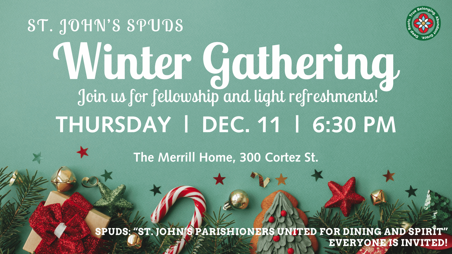 Warm up with winter fellowship at our SPUDS’ Winter Gathering! All are welcome at Jeff & Sara Merrill’s home (303 Cortez St., 32303) as we come together to enjoy each other’s company. “SPUDS” stands for “St. John’s Parishioners United for Dining and Spirit!” In other words, everyone is invited!