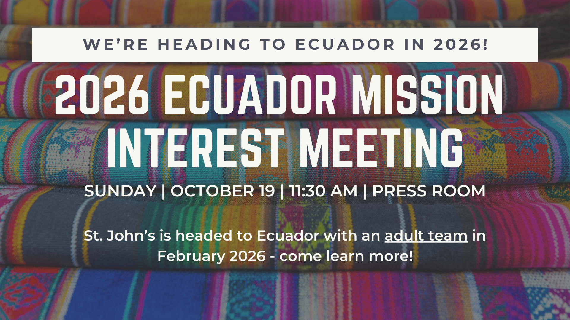 St. John’s is preparing for an exciting mission trip to Ecuador in mid-February 2026 (exact dates to be confirmed soon).