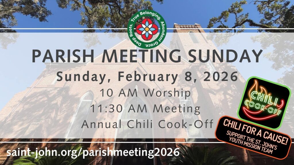 St. John’s will hold our Annual Parish Meeting on Sunday, February 8, at our combined worship service at 10 AM. If you are joining us online, simply stay on the worship feed. Those attending in person are invited to enjoy fellowship at our Annual Chili Cook-Off after the meeting!